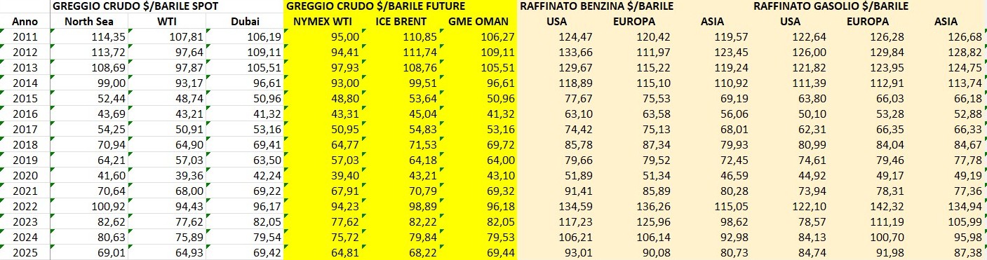 QUOTAZIONI GREGGI E RAFFINATI, MARGINI RAFFINAZIONE E CRACK SPREAD PIAZZE MONDIALI MEDIE ANNUE 2011-2025