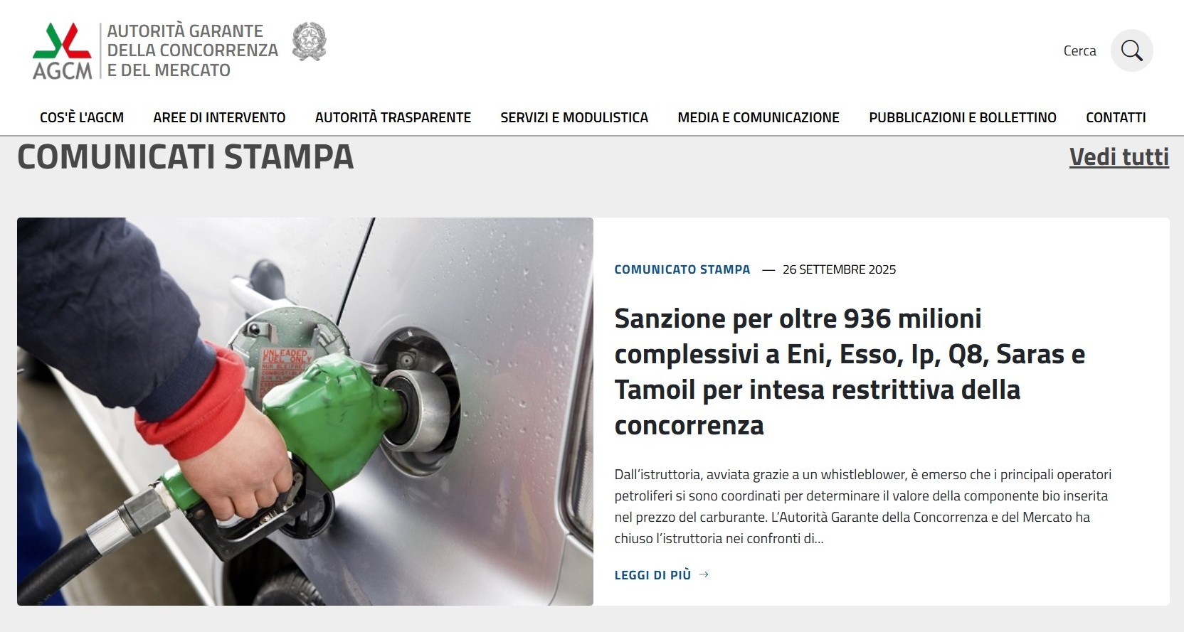 Antitrust avvia nel 2023 un’indagine, su segnalazione anonima, accertando in via desuntiva (poiché, scrive l’Authority «la concertazione tra imprese può essere desunta in via indiziaria da una serie di elementi oggettivi») l’esistenza di un cartello tra imprese, ossia «un’intesa avente a oggetto la componente di costo derivante dagli obblighi di miscelazione del biocarburante nel carburante per autotrazione, che verrebbe ribaltata nella stessa entità a tutti gli operatori di mercato indipendentemente dal costo effettivamente sostenuto da ciascuna compagnia petrolifera. Secondo il segnalante la pratica si sarebbe verificata costantemente negli ultimi anni e si sarebbe realizzata attraverso un sistema di annunci pubblici delle compagnie petrolifere avvenuti sul giornaleLa Staffetta Quotidiana”, iniziati da ENI nel gennaio 2020».
