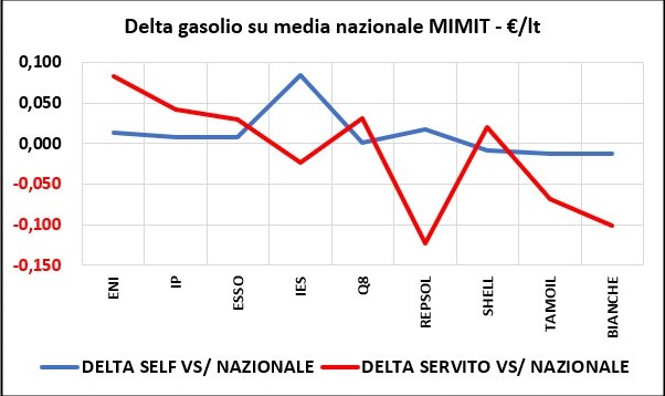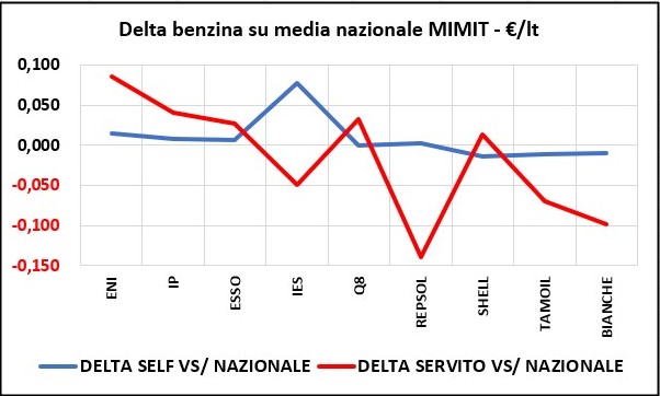 I prezzi medi di benzina e gasolio in Italia nella rete in modalità «self» e «servito», distinti per marchio e cumulati per la tipologia delle «pompe bianche» [su fonte: Osservatorio Prezzi Carburanti MIMIT elaborati nel Dossier Prezzi quotidiano di Staffetta e FOCUS di Quotidiano Energia], confrontati con la media mensile del prezzo medio nazionale calcolato sui dati giornalieri MIMIT (Open data, Il prezzo alle 8).