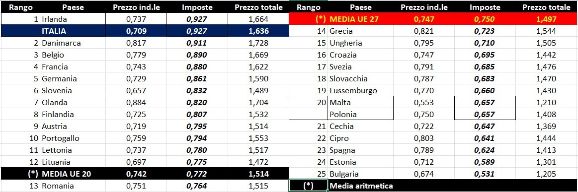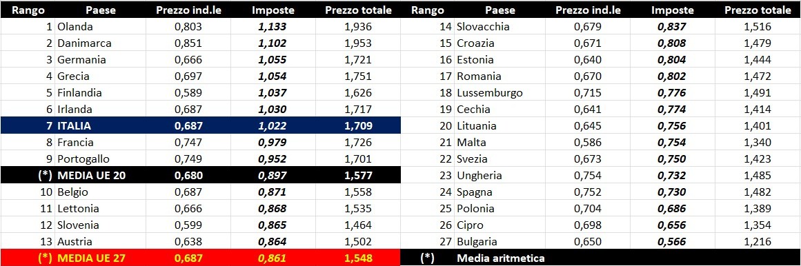 Per quanto attiene la rilevanza delle imposte sui carburanti, l’Italia si colloca al 06.10.2025 al settimo posto per il prodotto benzina, con 1,022 euro/litro su totali 1,709 di prezzo al pubblico (contro la media di 0,861 a 27 Paesi e di 0,897 a 20 Paesi area euro), nonché al primo posto (assieme all’Irlanda) per il gasolio con 0,927 euro/litro su 1,636 di prezzo al consumo (contro la media di 0,750 a 27 Paesi e di 0,772 a 20 Paesi area euro).