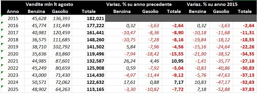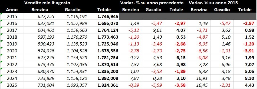 Esaminando non già il progressivo gennaio-agosto, ma lo specifico mese di AGOSTO – caratterizzato anche dalla mobilità del periodo feriale estivo -, nella rete stradale si osserva che le vendite sommate di benzina e gasolio sono le meno elevate di tutti i mesi di agosto dal 2022 al 2025 (ossia dei quattro esercizi esercizi in cui le vendite di agosto hanno superato 1,8 miliardi di litri), con un decremento del -3,58 % sull’agosto 2024 e un incremento del +4,43 % sull’agosto 2015; nel dettaglio dei prodotti, sul 2024 le vendite di benzina sono diminuite del -0,39 % e quelle di gasolio del -5,59 %; rispetto all’agosto 2015 l’incremento per la benzina è di +16,45 punti percentuali mentre il gasolio cala di un -2,31 punti percentuali.