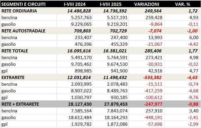 - le vendite complessive di benzina, gasolio e gpl nel periodo gennaio-agosto sono pari a 27,879 miliardi di litri contro i 28,127 dello stesso periodo 2024, con una variazione negativa assoluta di -248,0 milioni di litri ed una variazione di -0,88 punti percentuali;