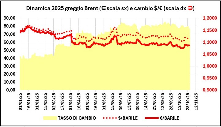 EVOLUZIONE DELLE QUOTAZIONI DEL GREGGIO E DEL CAMBIO NEL 2025 FINO AL 31/10