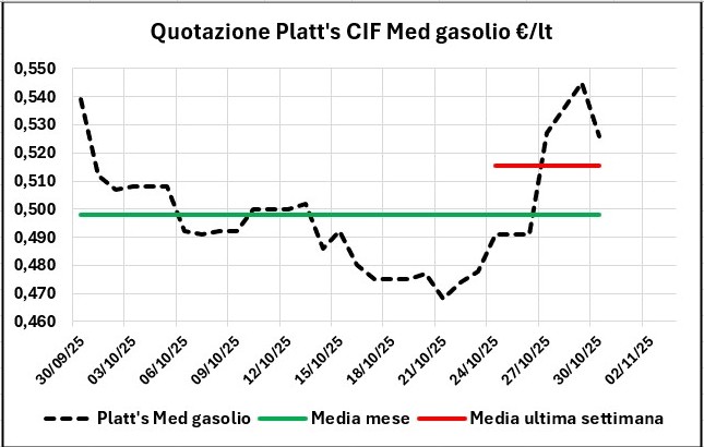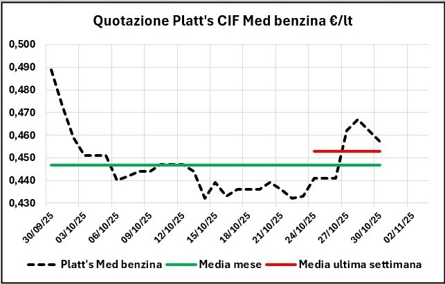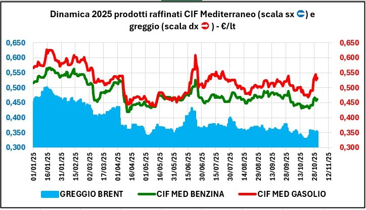 Nell’arco di una settimana, dal 23/10/2025 al 30/10/2025 la quotazione Platt’s CIF Med dei prodotti ha registrato una variazione in crescita di +0,029 con IVA per la benzina e di +0,059 per il gasolio, mentre i prezzi sono saliti di +0,010/+0,011 €/lt per la benzina e per il gasolio di +0,020/+0,022, a seconda modalità di vendita.