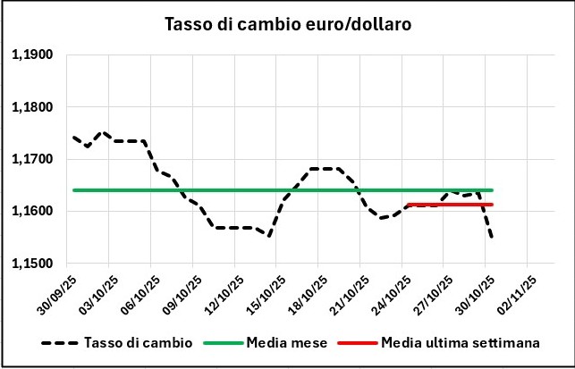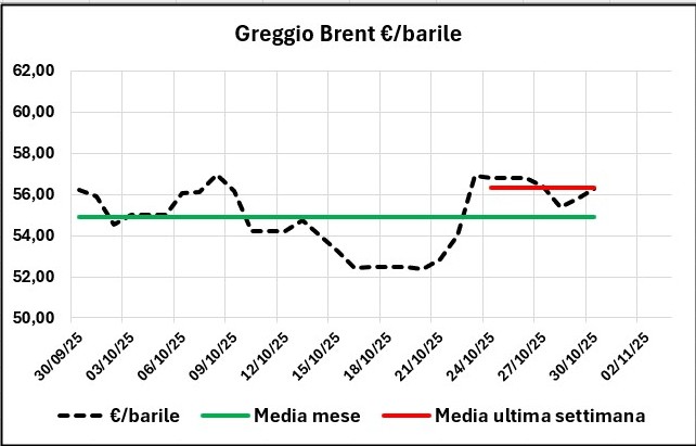 La quotazione del greggio di riferimento è aumentata in misura minima dal 30/09/2025 al 30/10/2025, da 56,24 a 56,28 €/barile, con un incremento di +0,04 (+0,07 %), con un tasso di cambio deprezzato del -1,63 % (da 1,1741 a 1,1550 dollari per un euro).