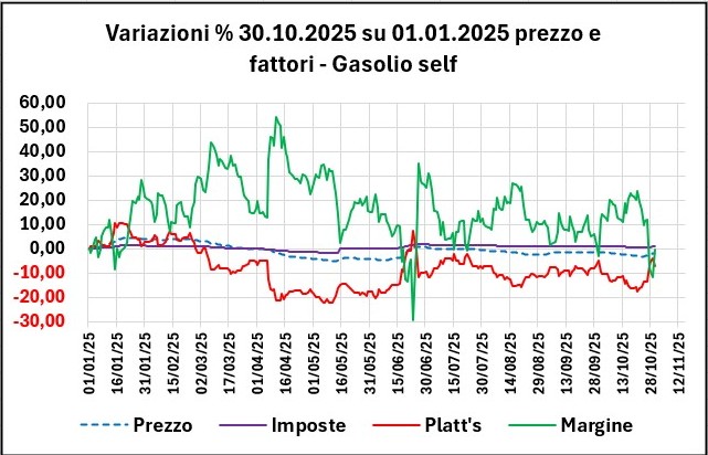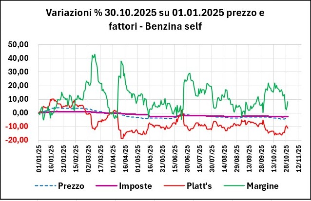 I valori al 30/10/2025 dei fondamentali di mercato sono in ogni caso ancora inferiori alla media annua del 2025 per il greggio Brent (56,28 €/barile contro una media di 61,97), e sono inferiori solo per il raffinato benzina (0,457 €/lt contro una media di 0,481) ma non per il raffinato gasolio (0,526 contro 0,519), con un tasso di cambio ben superiore: 1,1550 dollari per un euro contro una media di 1,1231.
