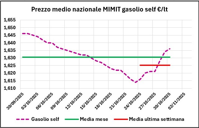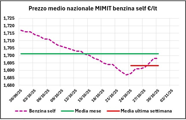 Sulla base del prezzo medio nazionale di tutta la rete, elaborato sul file “Il prezzo alle 8” del MIMIT, si osserva che dal 23/10/2025 al 30/10/2025 il prezzo della benzina è aumentato in self di +0,011 €/lt (da 1,687 a 1,698, +0,65 %) e in servito di +0,010 (da 1,828 a 1,838, +0,55 %); quello del gasolio è salito in self di +0,022 €/lt (da 1,614 a 1,636, +1,36 %) ed in servito di +0,020 (da 1,755 a 1,775, +1,14 %).