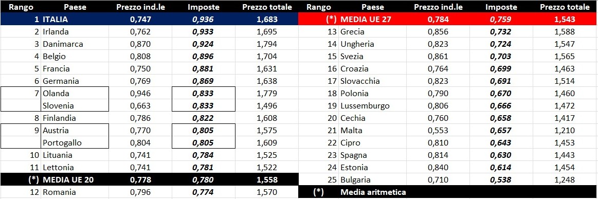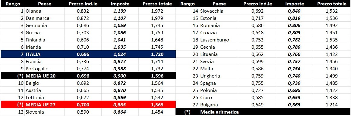 Per quanto attiene la rilevanza delle imposte sui carburanti, l’Italia si colloca al 17.11.2025 al settimo posto per il prodotto benzina, con 1,024 euro/litro su totali 1,720 di prezzo al pubblico (contro la media di 0,865 a 27 Paesi e di 0,900 a 20 Paesi area euro), nonché al primo posto per il gasolio con 0,936 euro/litro su 1,683 di prezzo al consumo (contro la media di 0,759 a 27 Paesi e di 0,780 a 20 Paesi area euro).