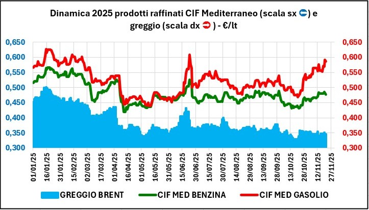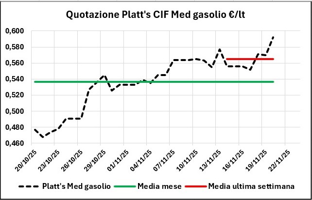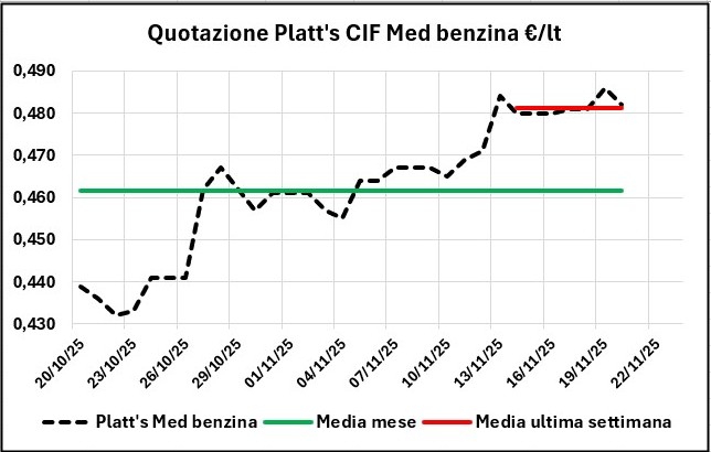Nell’arco di una settimana, dal 13/11/2025 al 20/11/2025 la quotazione Platt’s CIF Med dei prodotti ha registrato una variazione in calo di -0,002 con IVA per la benzina e in crescita di +0,018 per il gasolio, mentre i prezzi sono saliti di +0,011/+0,012 €/lt per la benzina, a seconda della modalità di vendita, e per il gasolio di +0,021.