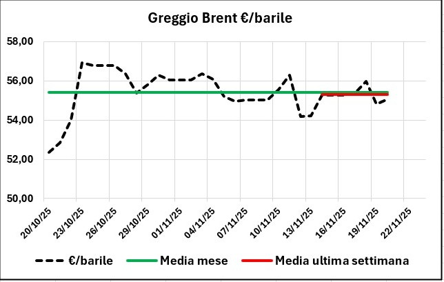 La quotazione del greggio di riferimento è aumentata dal 20/10/2025 al 20/11/2025, da 52,36 a 55,05 €/barile, con un incremento di +2,69 (+5,14 %), con un tasso di cambio deprezzato del -0,90 % (da 1,1655 a 1,1514 dollari per un euro).