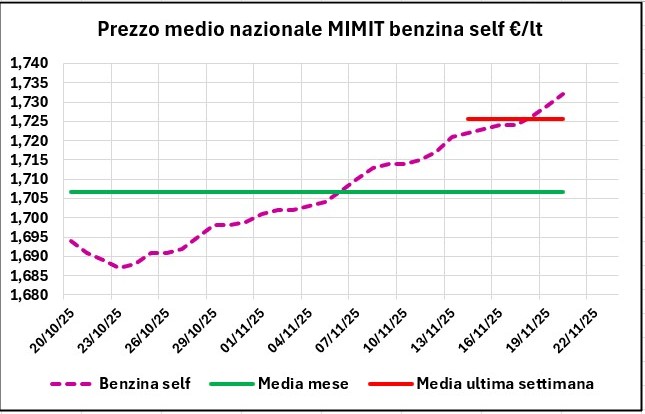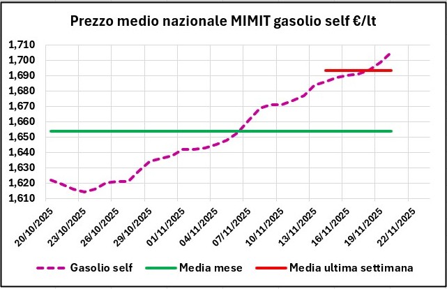 Sulla base del prezzo medio nazionale di tutta la rete, elaborato sul file “Il prezzo alle 8” del MIMIT, si osserva che dal 20/10/2025 al 20/11/2025 il prezzo della benzina in self è aumentato di +0,038 €/lt (da 1,694 a 1,732, +2,24 %) ed è aumentato in servito di +0,037 (da 1,834 a 1,871, +2,02 %); quello del gasolio è aumentato in self di +0,083 €/lt (da 1,622 a 1,705, +5,12 %) ed in servito di +0,080 (da 1,762 a 1,842, +4,54 %).