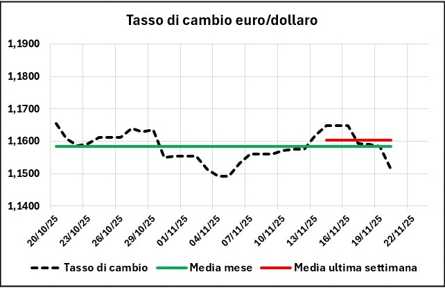 La quotazione del greggio di riferimento è aumentata dal 13/11/2025 al 20/11/2025, da 54,23 a 55,05 €/barile, ossia di +0,82 (+1,51 %), con un tasso di cambio in apprezzamento con variazione del +0,75 % (da 1,1619 a 1,1514 dollari per un euro).