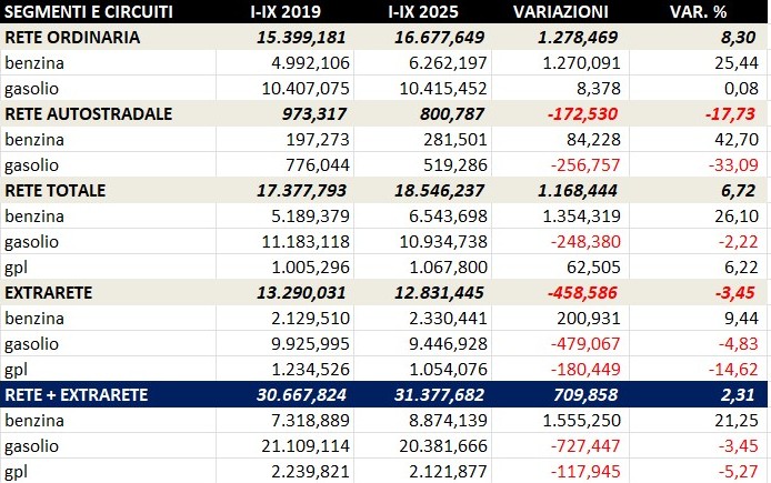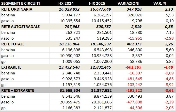 - le vendite complessive di benzina, gasolio e gpl nel periodo gennaio-settembre sono pari a 31,378 miliardi di litri contro i 31,570 dello stesso periodo 2024, con una variazione negativa assoluta di -191,8 milioni di litri ed una variazione di -0,61 punti percentuali e contro i 30,668 dello stesso periodo 2019, con una variazione positiva assoluta di +709,9 milioni di litri ed una variazione di +2,31 punti percentuali;