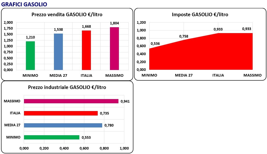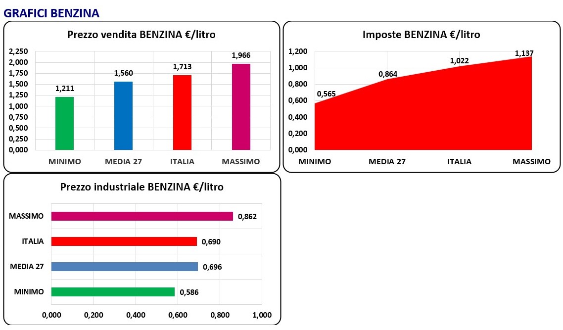 La statistica offre anche la scomposizione dei prezzi in relazione alle imposte [anche con il confronto con lo stesso mese dell’anno precedente], al prezzo industriale, nonché la determinazione dello «stacco Italia» del prezzo al consumo, delle imposte e del prezzo industriale.