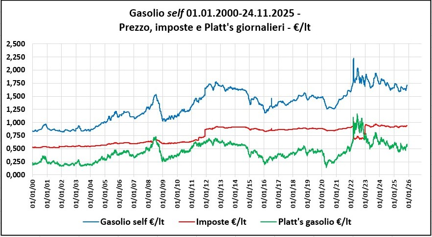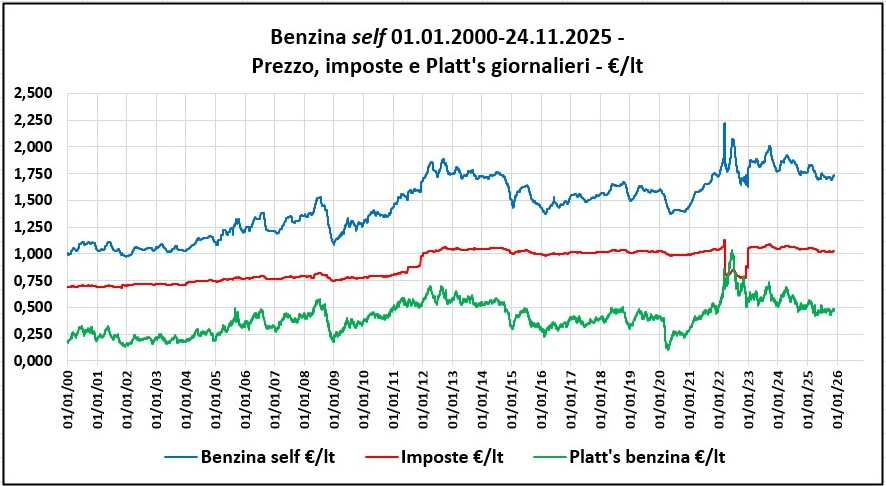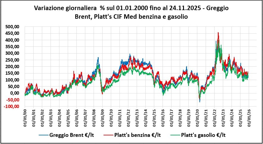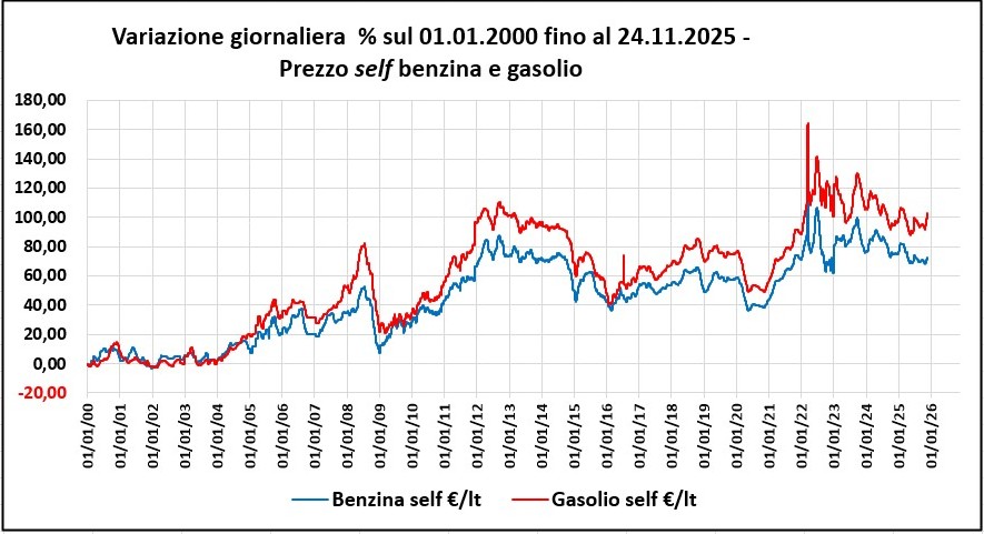 • variazione % al 24.11.2025 sul 01.01.2000: benzina +72,75 %, gasolio +103,15 %