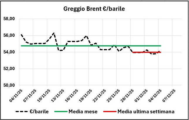 La quotazione del greggio di riferimento è diminuita dal 04/11/2025 al 04/12/2025, da 56,08 a 54,23 €/barile, con un decremento di -1,85 (-3,30 %), con un tasso di cambio apprezzato del +1,52 % (da 1,1491 a 1,1666 dollari per un euro).
