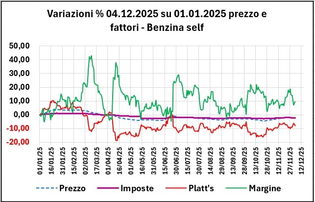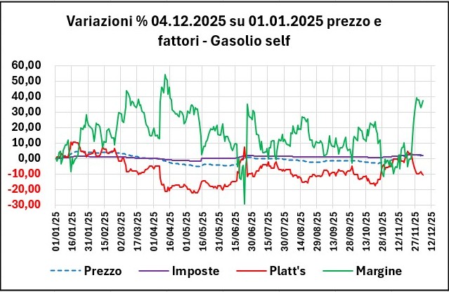 I valori al 04/12/2025 dei fondamentali di mercato sono in ogni caso ancora inferiori alla media annua del 2025 per il greggio Brent (54,23 €/barile contro una media di 61,24), e sono inferiori sia per il raffinato benzina (0,475 €/lt contro una media di 0,480) che per il raffinato gasolio (0,506 contro 0,523), con un tasso di cambio ben superiore: 1,1614 dollari per un euro contro una media di 1,1264.