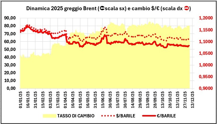 EVOLUZIONE DELLE QUOTAZIONI DEL GREGGIO E DEL CAMBIO NEL 2025 FINO AL 05/12