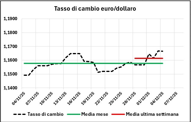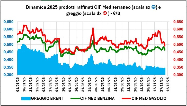 La quotazione del greggio di riferimento è calata di poco dal 27/11/2025 al 04/12/2025, da 54,67 a 54,23 €/barile, ossia di -0,44 (-0,80 %), con un tasso di cambio in apprezzamento con variazione del +0,63 % (da 1,1586 a 1,1666 dollari per un euro).