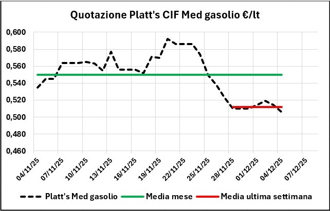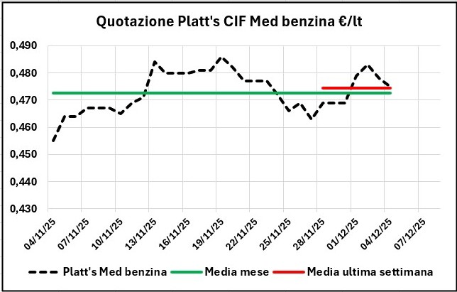 Nell’arco di una settimana, dal 27/11/2025 al 04/12/2025 la quotazione Platt’s CIF Med dei prodotti ha registrato una variazione in aumento di +0,015 €/lt con IVA per la benzina e in flessione di -0,021 per il gasolio, mentre i prezzi sono calati di -0,008 €/lt per la benzina, e anche per il gasolio di -0,010/-0,011 a seconda della modalità di vendita.