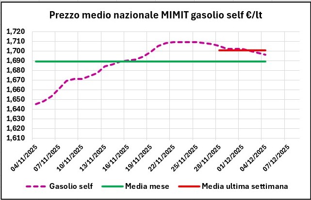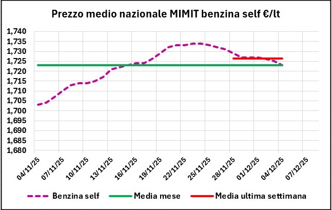 Sulla base del prezzo medio nazionale di tutta la rete, elaborato sul file “Il prezzo alle 8” del MIMIT, si osserva che dal 27/11/2025 al 04/12/2025 il prezzo della benzina è calato in self di -0,008 €/lt (da 1,731 a 1,723, -0,46 %) e anche in servito di -0,008 (da 1,871 a 1,863, -0,43 %); quello del gasolio è sceso in self di -0,011 €/lt (da 1,707 a 1,696, -0,64 %) ed in servito di -0,010 (da 1,845 a 1,835, -0,54 %).
