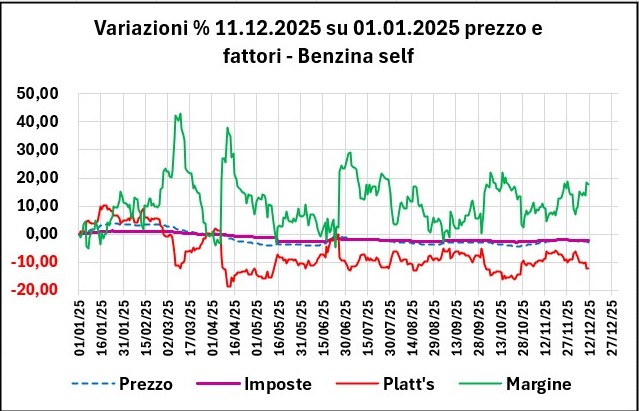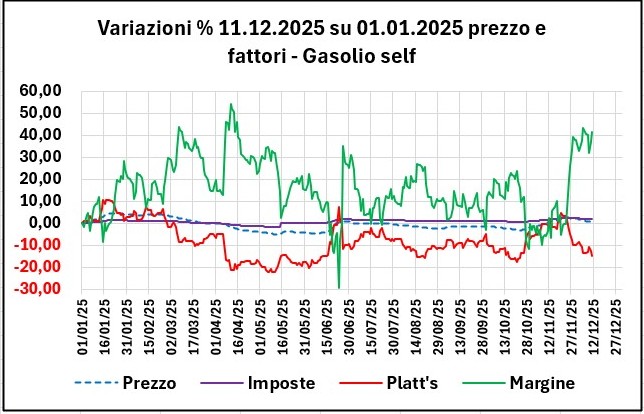 I valori al 11/12/2025 dei fondamentali di mercato sono in ogni caso ancora inferiori alla media annua del 2025 per il greggio Brent (52,31 €/barile contro una media di 61,09), e sono inferiori sia per il raffinato benzina (0,453 €/lt contro una media di 0,480) che per il raffinato gasolio (0,483 contro 0,522), con un tasso di cambio ben superiore: 1,1714 dollari per un euro contro una media di 1,1274.