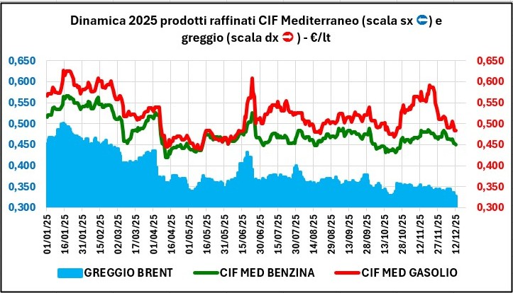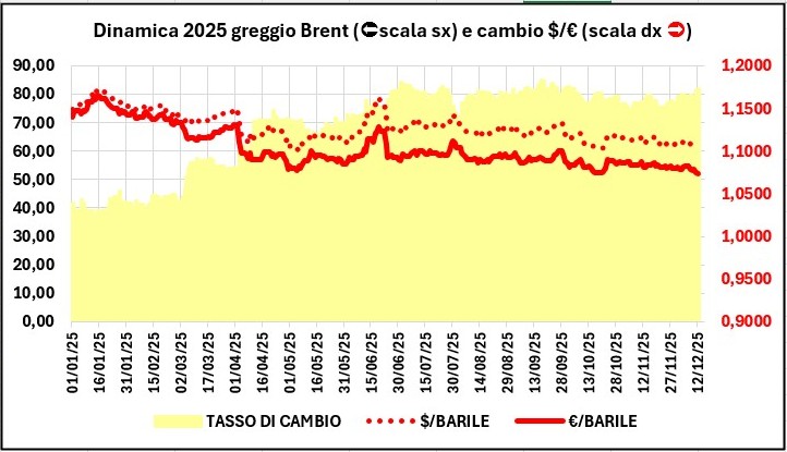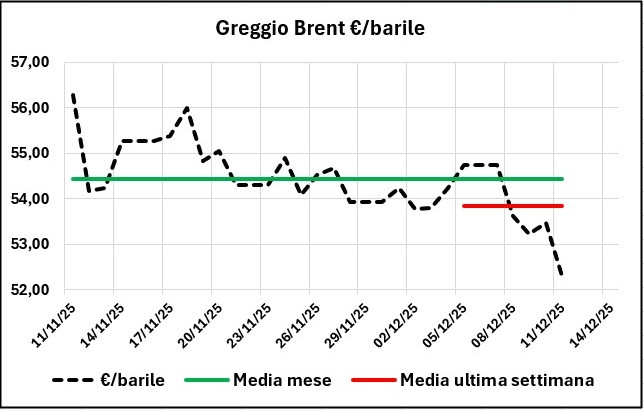 La quotazione del greggio di riferimento è diminuita dal 11/11/2025 al 11/12/2025, da 56,29 a 52,31 €/barile, con un decremento di -3,98 (-7,07 %), con un tasso di cambio apprezzato del +1,20 % (da 1,1575 a 1,1714 dollari per un euro).