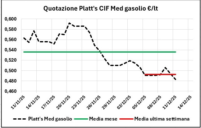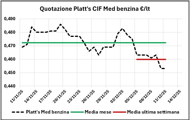 Nell’arco di una settimana, dal 04/12/2025 al 11/12/2025 la quotazione Platt’s CIF Med dei prodotti ha registrato una variazione in diminuzione di -0,027 €/lt con IVA per la benzina e di -0,028 per il gasolio, mentre i prezzi sono calati di -0,007 €/lt per la benzina, e anche per il gasolio di -0,019.
