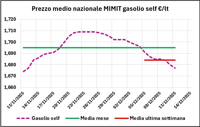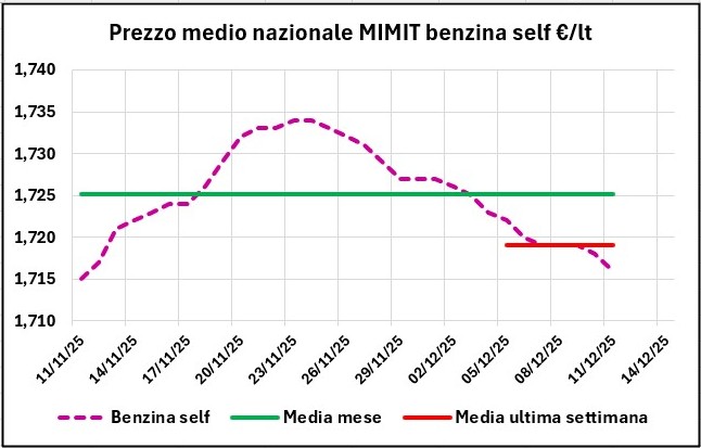 Sulla base del prezzo medio nazionale di tutta la rete, elaborato sul file “Il prezzo alle 8” del MIMIT, si osserva che dal 04/12/2025 al 11/12/2025 il prezzo della benzina è calato in self di -0,007 €/lt (da 1,723 a 1,716, -0,41 %) e anche in servito di -0,007 (da 1,863 a 1,856, -0,38 %); quello del gasolio è sceso in self di -0,019 €/lt (da 1,696 a 1,677, -1,12 %) e anche in servito di -0,019 (da 1,835 a 1,816, -1,04 %).