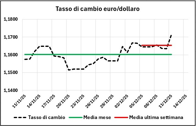 La quotazione del greggio di riferimento è calata dal 04/12/2025 al 11/12/2025, da 54,23 a 52,31 €/barile, ossia di -1,92 (-3,54 %), con un tasso di cambio in apprezzamento con variazione del +0,41 % (da 1,1666 a 1,1714 dollari per un euro).
