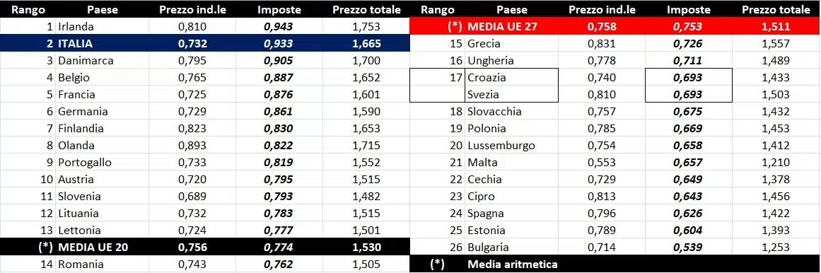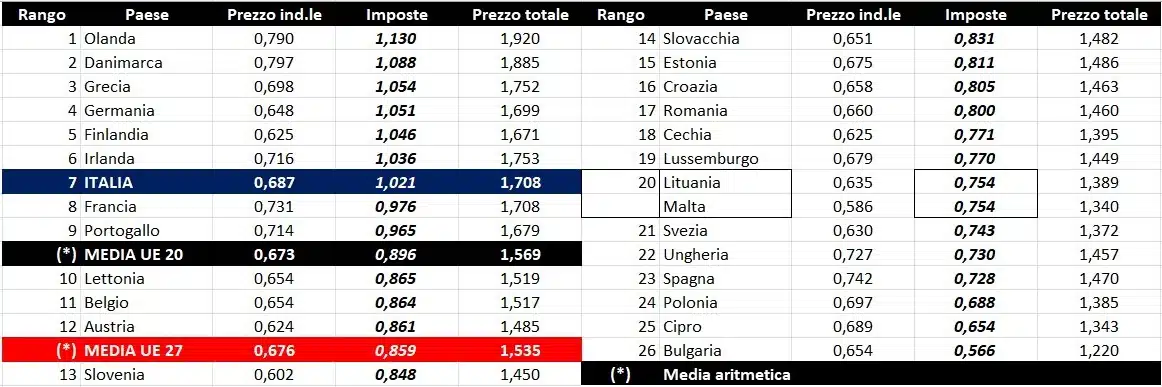 Per quanto attiene la rilevanza delle imposte sui carburanti, l’Italia si colloca al 15.12.2025 al settimo posto per il prodotto benzina, con 1,021 euro/litro su totali 1,708 di prezzo al pubblico (contro la media di 0,859 a 27 Paesi e di 0,896 a 20 Paesi area euro), nonché al secondo posto per il gasolio con 0,933 euro/litro su 1,665 di prezzo al consumo (contro la media di 0,753 a 27 Paesi e di 0,774 a 20 Paesi area euro).