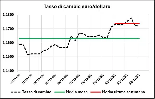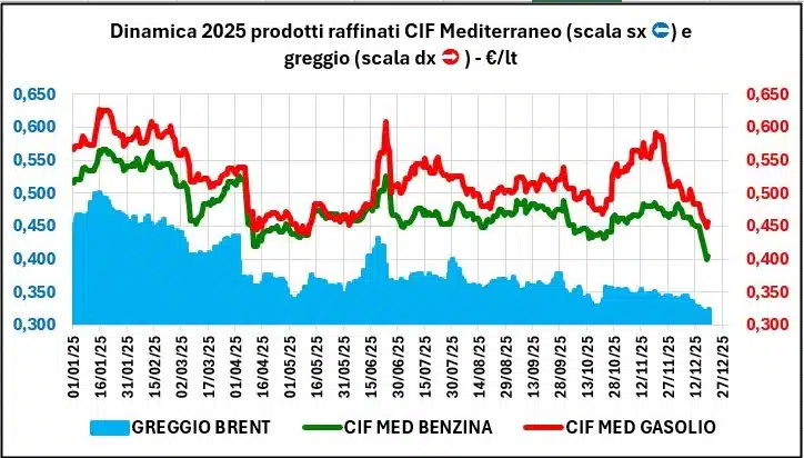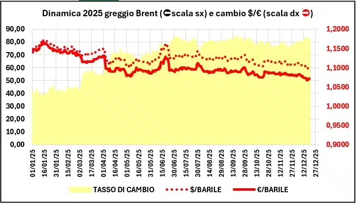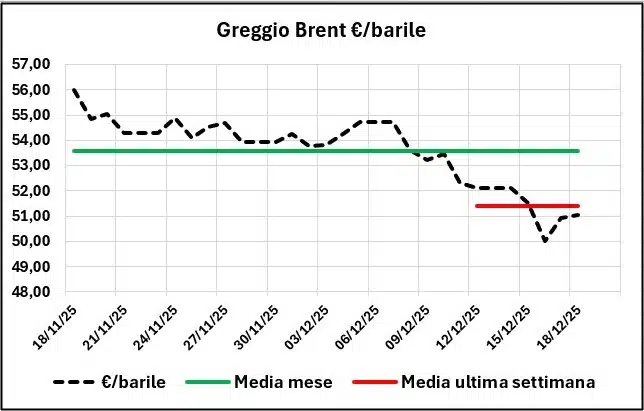 La quotazione del greggio di riferimento è diminuita dal 18/11/2025 al 18/12/2025, da 55,99 a 51,05 €/barile, con un decremento di -4,94 (-8,82 %), con un tasso di cambio apprezzato del +1,11 % (da 1,1590 a 1,1719 dollari per un euro).