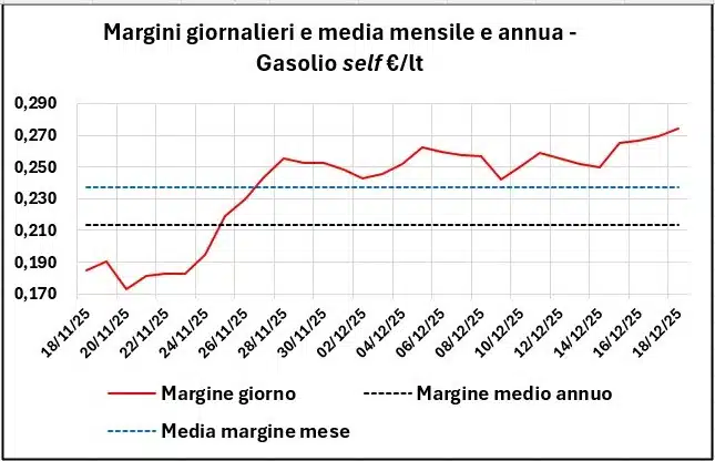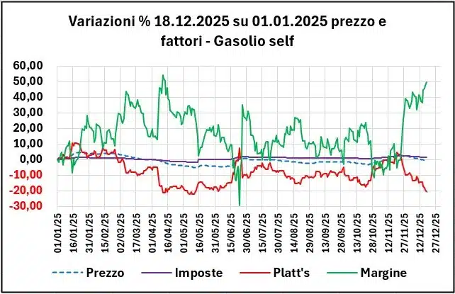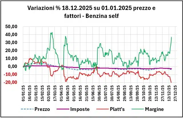 I valori al 18/12/2025 dei fondamentali di mercato sono in ogni caso ancora inferiori alla media annua del 2025 per il greggio Brent (51,05 €/barile contro una media di 60,90), e sono inferiori sia per il raffinato benzina (0,400 €/lt contro una media di 0,479) che per il raffinato gasolio (0,449 contro 0,521), con un tasso di cambio ben superiore: 1,1719 dollari per un euro contro una media di 1,1283.
