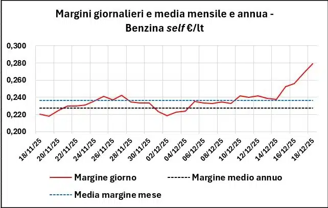 I prezzi del 18/12/2025 sono ancora inferiori alla media del periodo 01/01/2025-18/12/2025 per la benzina per i seguenti valori: benzina self -0,040 €/lt, benzina servito -0,040; e per il gasolio: self -0,006, servito -0,007.