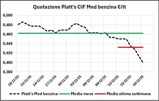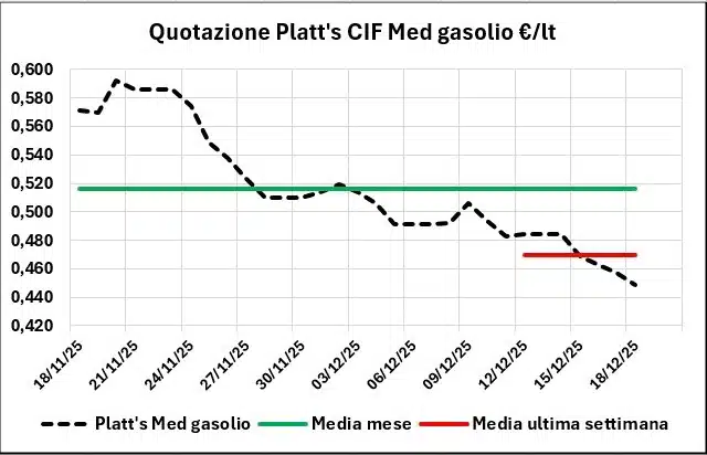 Nell’arco di una settimana, dal 11/12/2025 al 18/12/2025 la quotazione Platt’s CIF Med dei prodotti ha registrato una variazione in diminuzione di -0,065 €/lt con IVA per la benzina e di -0,041 per il gasolio, mentre i prezzi sono calati di -0,016/-0,017 €/lt per la benzina, e per il gasolio di -0,022/-0,023, a seconda delle modalità di vendita.