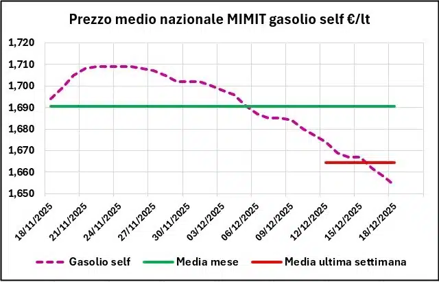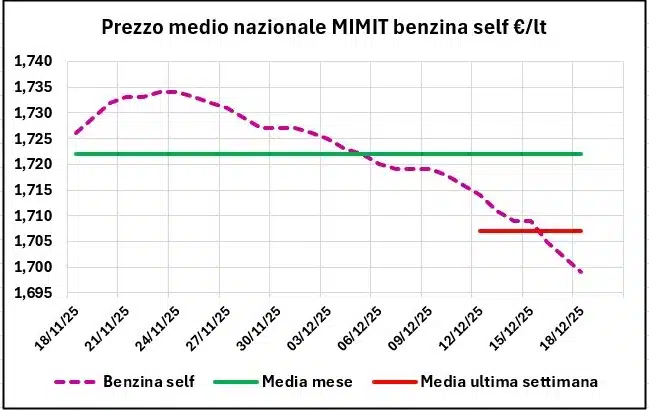 Sulla base del prezzo medio nazionale di tutta la rete, elaborato sul file “Il prezzo alle 8” del MIMIT, si osserva che dal 11/12/2025 al 18/12/2025 il prezzo della benzina è calato in self di -0,017 €/lt (da 1,716 a 1,699, -0,99 %) e in servito di -0,016 (da 1,856 a 1,840, -0,86 %); quello del gasolio è sceso in self di -0,023 €/lt (da 1,677 a 1,654, -1,37 %) e anche in servito di -0,022 (da 1,816 a 1,794, -1,21 %).