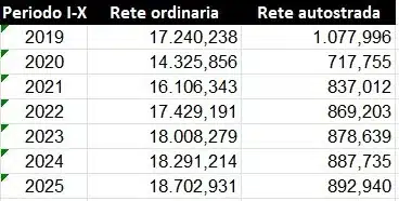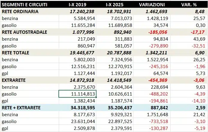 - le vendite complessive di benzina e gasolio nel circuito della rete – segmento rete autostradale sono pari a 892,9 milioni di litri contro gli 887,7 dello stesso periodo 2024, con una variazione positiva assoluta di +5,2 milioni di litri ed una variazione di +0,59 punti percentuali e contro i 1.078,0 dello stesso periodo 2019, con una variazione negativa assoluta di -185,1 milioni di litri ed una variazione di -17,1 punti percentuali;