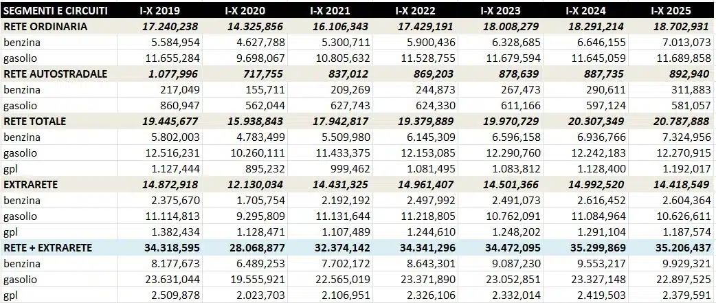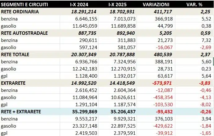 - le vendite complessive di benzina, gasolio e gpl nel periodo gennaio-ottobre sono pari a 35,206 miliardi di litri contro i 35,300 dello stesso periodo 2024, con una variazione negativa assoluta di -93,4 milioni di litri ed una variazione di -0,26 punti percentuali e contro i 34,319 dello stesso periodo 2019, con una variazione positiva assoluta di +887,8 milioni di litri ed una variazione di +2,59 punti percentuali;