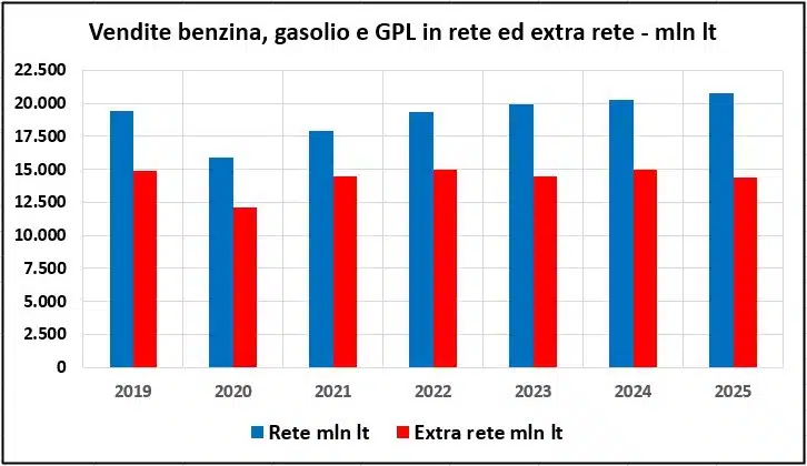 - le vendite complessive di benzina, gasolio e gpl nel circuito extra rete sono pari a 14,419 miliardi di litri contro i 14,993 dello stesso periodo 2024, con una variazione negativa assoluta di -574,0 milioni di litri ed una variazione di -3,83 punti percentuali e contro i 14,873 dello stesso periodo 2019, con una variazione negativa assoluta di -454,4 milioni di litri ed una variazione di -3,06 punti percentuali;