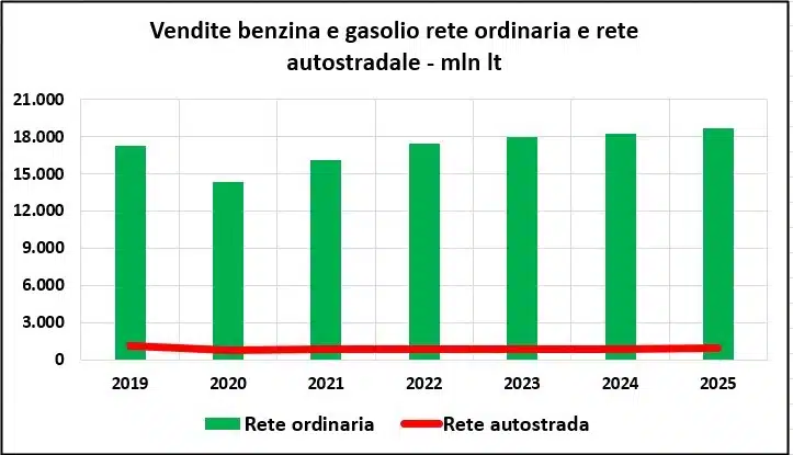 - le vendite complessive di benzina e gasolio nel circuito della rete – segmento rete ordinaria sono pari a 18,703 miliardi di litri contro i 18,291 dello stesso periodo 2024, con una variazione positiva assoluta di +411,7 milioni di litri ed una variazione di +2,25 punti percentuali e contro i 17,240 dello stesso periodo 2019, con una variazione positiva assoluta di +1.462,7 milioni di litri ed una variazione di +8,48 punti percentuali;