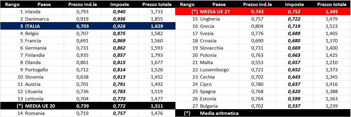 Per quanto attiene la rilevanza delle imposte sui carburanti, l’Italia si colloca al 29.12.2025 al settimo posto per il prodotto benzina, con 1,016 euro/litro su totali 1,679 di prezzo al pubblico (contro la media di 0,858 a 27 Paesi e di 0,894 a 20 Paesi area euro), nonché al terzo posto per il gasolio con 0,926 euro/litro su 1,629 di prezzo al consumo (contro la media di 0,752 a 27 Paesi e di 0,772 a 20 Paesi area euro).