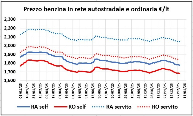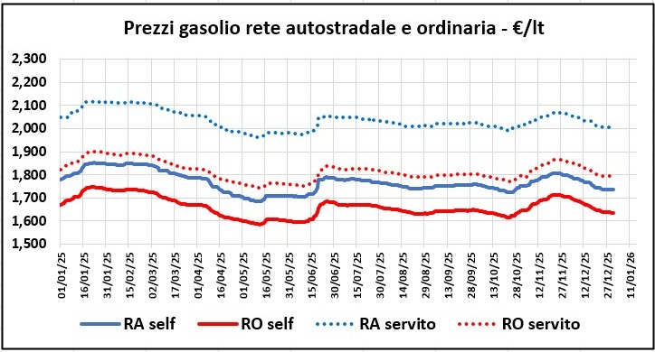 In particolare, per quanto attiene la benzina in modalità self il gap del prezzo tra rete autostradale e media della rete è pari come media dei mesi da gennaio a dicembre 2025 a +0,096 euro/litro, è pari a +0,094 verso il prezzo delle compagnie petrolifere e pari a +0,103 verso il prezzo degli operatori indipendenti, in modalità servito è pari, rispettivamente, a +0,204, +0,187 e +0,252 euro/litro, per quanto attiene il gasolio in modalità self il gap del prezzo tra rete autostradale e media della rete è pari come media dei mesi da gennaio a dicembre 2025 a +0,106 euro/litro, è pari a +0,103 verso il prezzo delle compagnie petrolifere e pari a +0,124 verso il prezzo degli operatori indipendenti, in modalità servito è pari, rispettivamente, a +0,219, +0,204 e +0,276 euro/litro; per il GPL è pari a +0,168 euro/litro verso la media della rete in modalità self ed a +0,134 in modalità servito; per il metano è pari a +0,114 euro/litro verso la media della rete in modalità self ed a +0,064 in modalità servito (il dato è dovuto alla presenza di impianti che erogano solo metano e di impianti multiprodotto); per il GNL, il prezzo medio della rete autostradale è più caro di +0,093 euro/litro verso la media della rete in modalità servito.