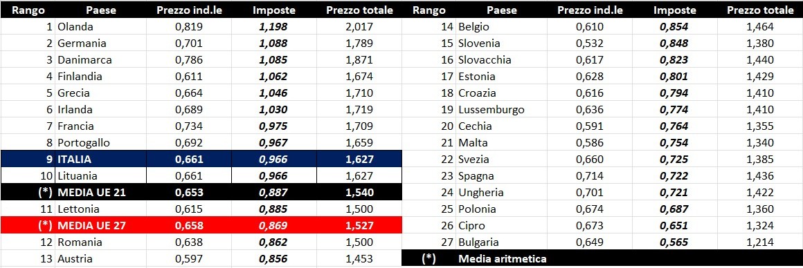 Nel confronto con i prezzi comunitari del 12.01.2026 con la benzina a 1,627 euro/litro, l’Italia si colloca in nona posizione (ex aequo con la Lituania in funzione dell’errore sopra esposto), preceduta, in ordine di grandezza decrescente, da Olanda, Danimarca, Germania, Irlanda, Grecia, Francia, Finlandia e Portogallo, con media aritmetica dei 27 Paesi pari a 1,527 euro/litro e media aritmetica dei Paesi di Eurozona uguale a 1,540 euro/litro; con il gasolio a euro/litro 1,660, l’Italia si colloca in sesta posizione (ancora ex aequo con la Lituania in funzione del medesimo errore), preceduta da Olanda, Irlanda, Danimarca, Germania e Finlandia, con una media aritmetica dei 27 Paesi uguale a euro/litro 1,501 e media aritmetica per i Paesi di Eurozona uguale a 1,504 euro/litro.