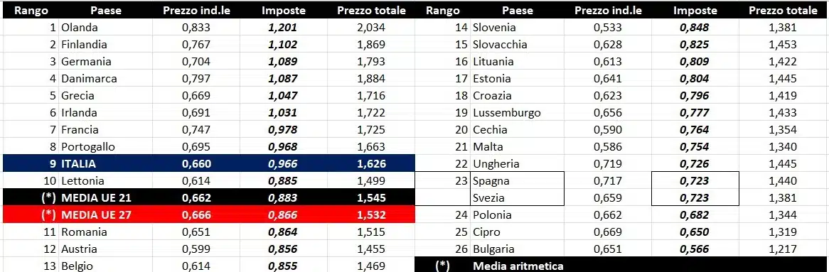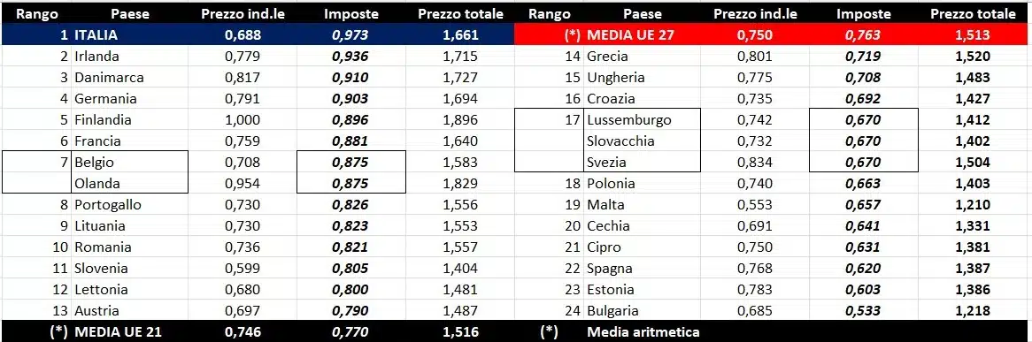 Per quanto attiene la rilevanza delle imposte sui carburanti, l’Italia si colloca al 19.01.2026 al nono posto per il prodotto benzina, con 0,966 euro/litro su totali 1,626 di prezzo al pubblico (contro la media di 0,866 a 27 Paesi e di 0,883 a 21 Paesi area euro), nonché al primo per il gasolio con 0,973 euro/litro su 1,661 di prezzo al consumo (contro la media di 0,763 a 27 Paesi e di 0,770 a 21 Paesi area euro).
