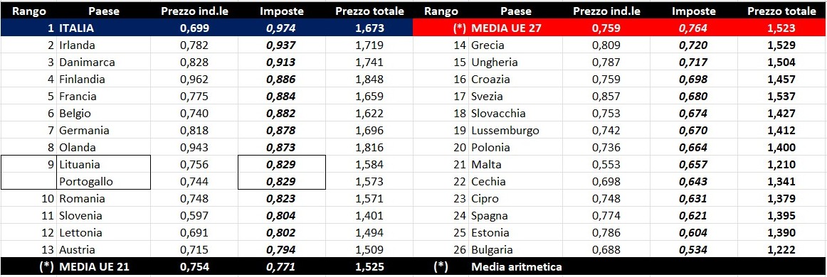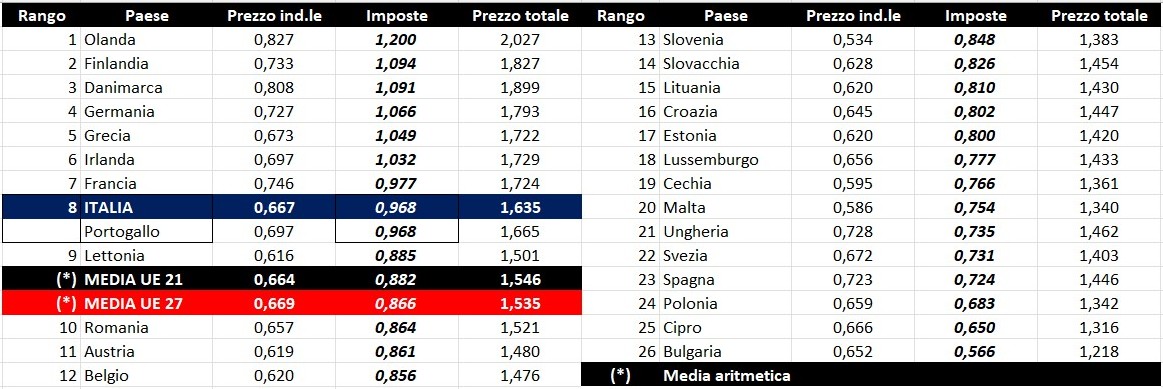 Per quanto attiene la rilevanza delle imposte sui carburanti, l’Italia si colloca al 26.01.2026 all’ottavo posto (ex aequo col Portogallo) per il prodotto benzina, con 0,968 euro/litro su totali 1,635 di prezzo al pubblico (contro la media di 0,866 a 27 Paesi e di 0,882 a 21 Paesi area euro), nonché al primo per il gasolio con 0,974 euro/litro su 1,673 di prezzo al consumo (contro la media di 0,764 a 27 Paesi e di 0,771 a 21 Paesi area euro).