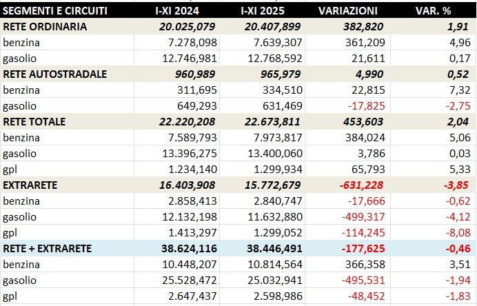 - le vendite complessive di benzina, gasolio e gpl nel periodo gennaio-novembre sono pari a 38,446 miliardi di litri contro i 38,624 dello stesso periodo 2024, con una variazione negativa assoluta di -177,6 milioni di litri ed una variazione di -0,46 punti percentuali e contro i 37,504 dello stesso periodo 2019, con una variazione positiva assoluta di +942,5 milioni di litri ed una variazione di +2,51 punti percentuali;