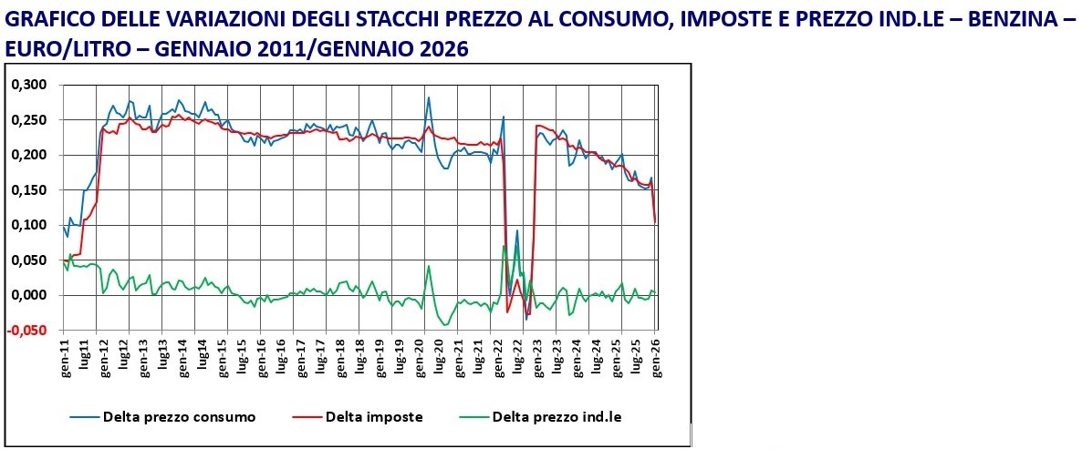 • dal gennaio 2011 al gennaio 2026 lo STACCO con l’Unione Europea per le grandezze relative alla benzina passa da +0,096 a +0,108 euro/litro (incremento di +0,012 euro/litro) per il prezzo al consumo, da +0,050 a +0,104 euro/litro (incremento di +0,054 euro/litro) per le imposte, nonché da +0,046 a +0,004 euro/litro (decremento di -0,042 euro/litro) per il prezzo industriale;