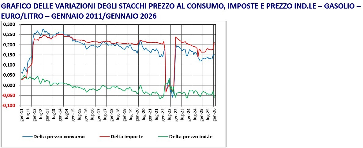 • la media di gennaio 2026 registra uno stacco per il prodotto gasolio determinato in: +0,151 euro/litro prezzo al consumo, +0,211 euro/litro imposte (139,74 % dello stacco) e -0,060 euro/litro prezzo industriale (-39,74 % dello stacco).