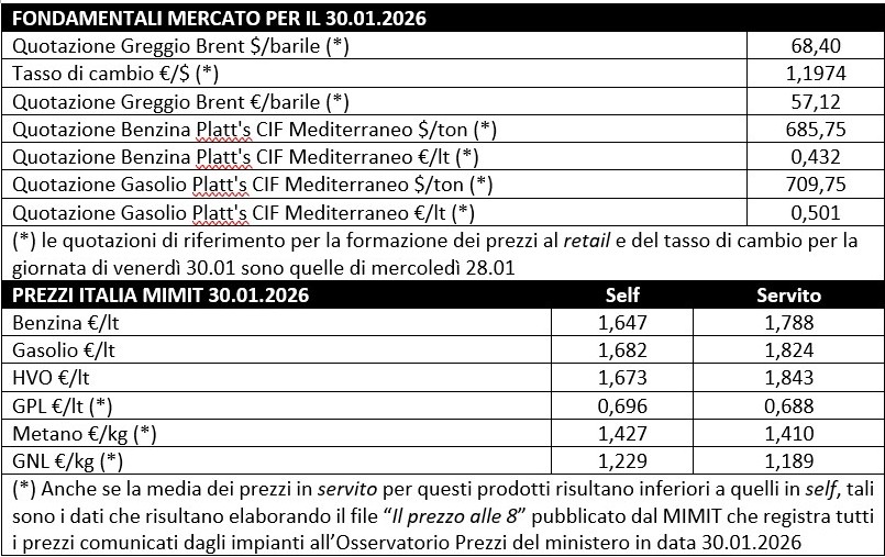 I valori al 29/01/2026 dei fondamentali di mercato sono diventati superiori alla media del periodo 29.01.2025-29.01.2026 per il greggio Brent (59,08 €/barile contro una media di 58,94), ma sono inferiori sia per il raffinato di riferimento giornaliero benzina (0,430 €/lt contro una media di 0,467) che per il gasolio (0,491 contro 0,509), con un tasso di cambio assai superiore: 1,1968 dollari per un euro contro una media di 1,1406.