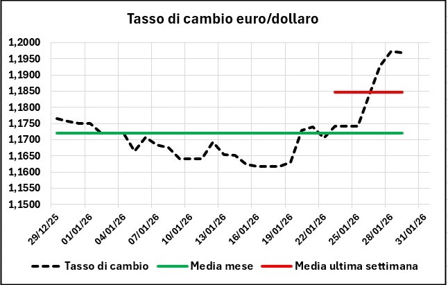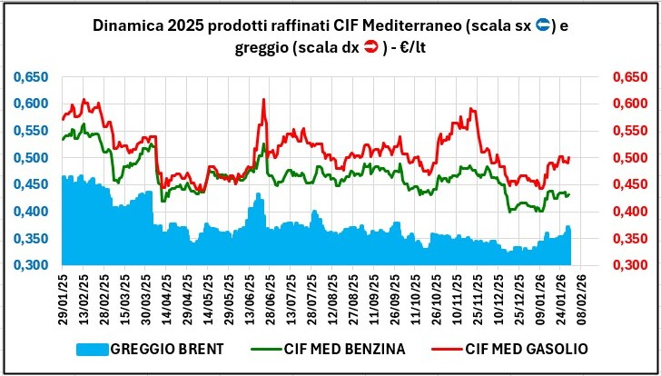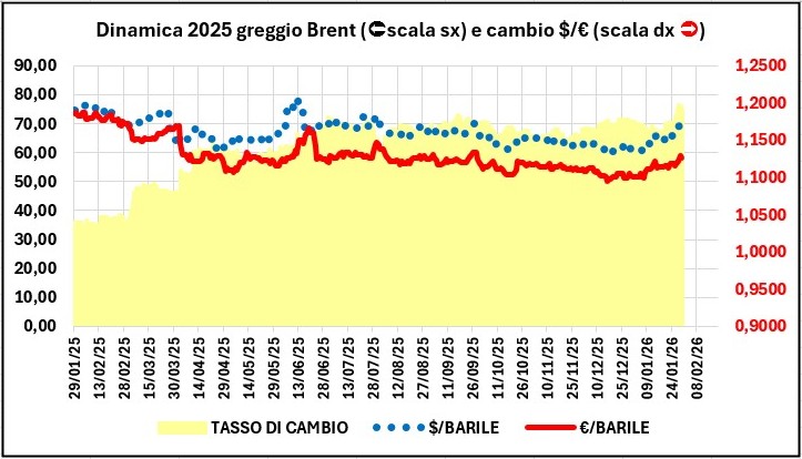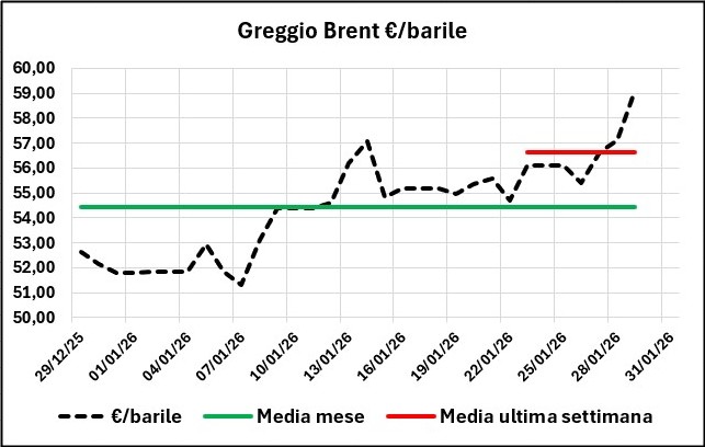Nella settimana dal 22/01/2026-29/01/2026 il greggio Brent è fortemente aumentato, in quotazioni in €/barile, da 54,72 a 59,08 (+4,36 e +7,97 %), con un apprezzamento del tasso di cambio attestato su una media della settimana di 1,1848 dollari per un euro contro 1,1665 della settimana antecedente.